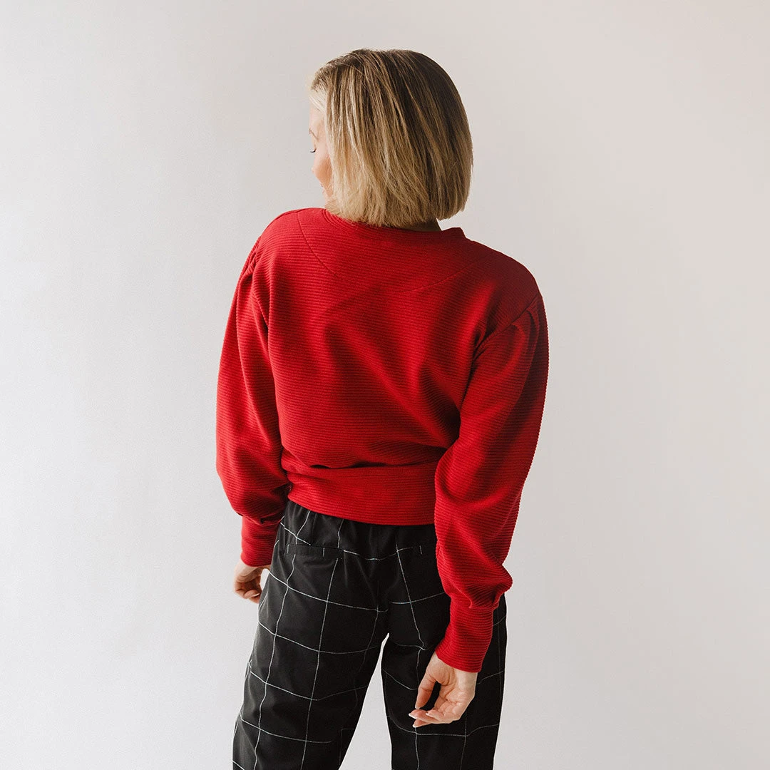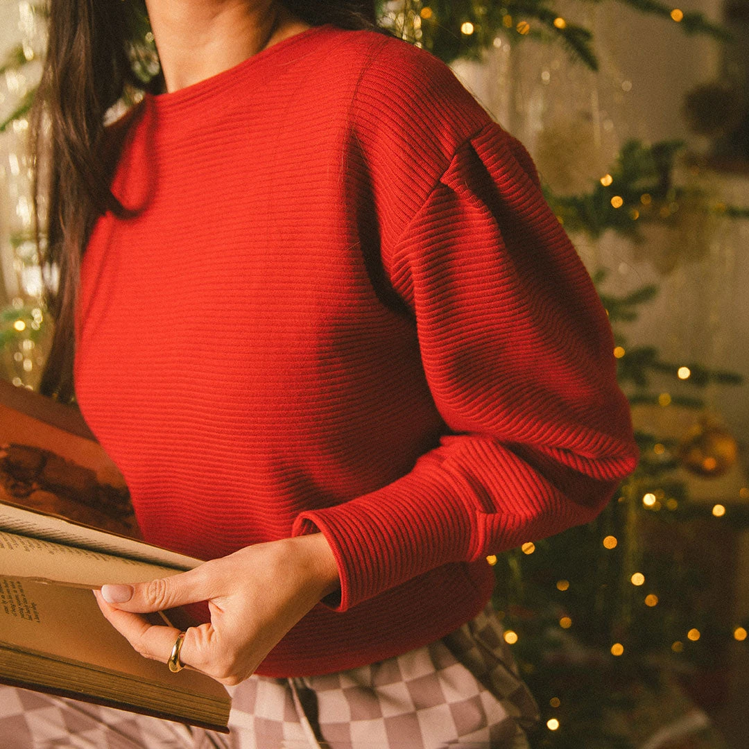 Nothing grabs our attention more than this gorgeous red shade! It’s our Atlas Ribbed Sweater in a festive new color that will tie together any outfit. Our favorite things about this top include its soft textured fabric and flattering crew-neck fit.