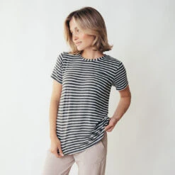 A basic tee with thick, gray stripes? Can’t go wrong there! Our tees are made from the softest fabric, and we love the way the collar contrasts with the stripe pattern! No such thing as too many tees, right?