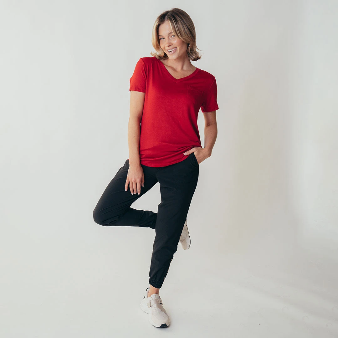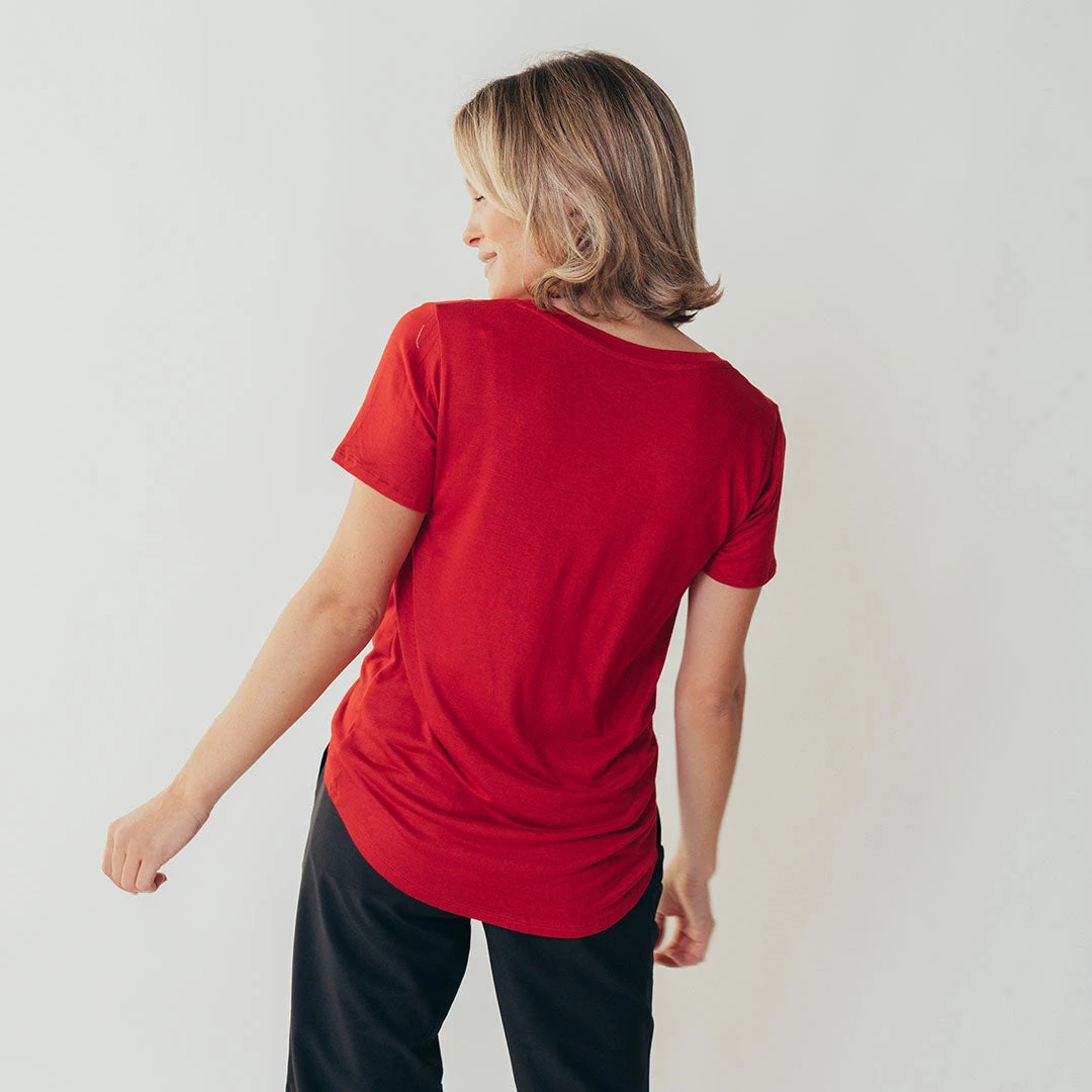 Our classic v-neck tee is on fire in this bright red! As soft as always, our tees are the perfect solo piece or to layer up with your favorite zip-up or pullover.Â