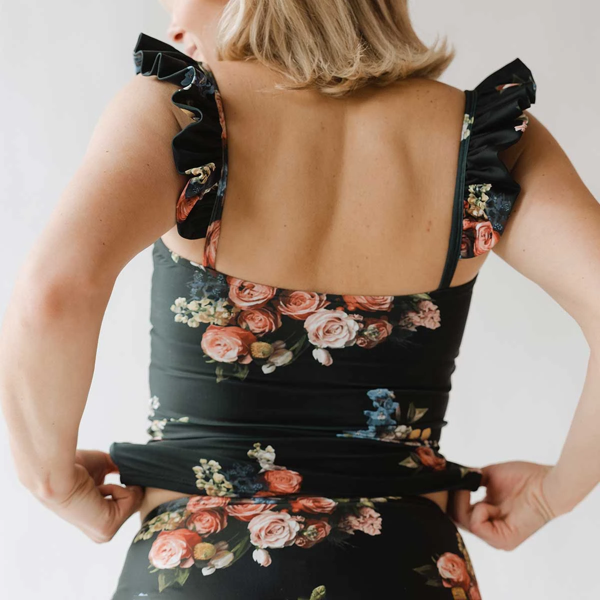 Up your swim style with our Bella Tankini in Rose Black! Perfect for mixing and matching with your favorite bottoms, this tankini top offers a bit more coverage complete with our gorgeous black rose print and oh-so-romantic ruffle straps.Â