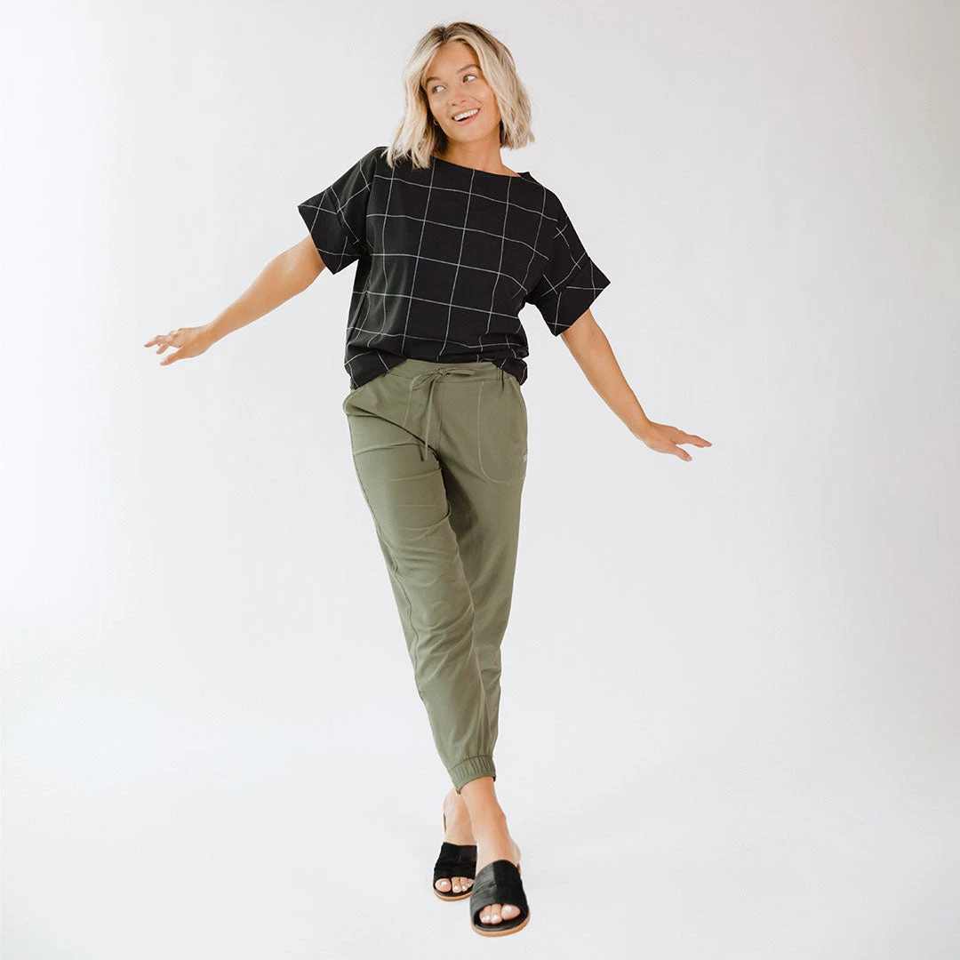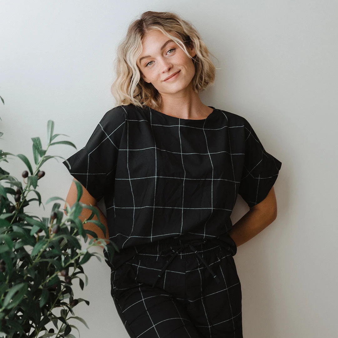 Featuring the same great, wrinkle-free fabric as our Jetsetters, this cropped boxy tee is a must-have! The flattering boat neckline and longer, boxy sleeve makes it an instant classic! Dress it up or down, this top goes great with any style of bottoms and can be paired with Black Windowpane Destination Joggers for a super cute matching set that looks like a jumpsuit!