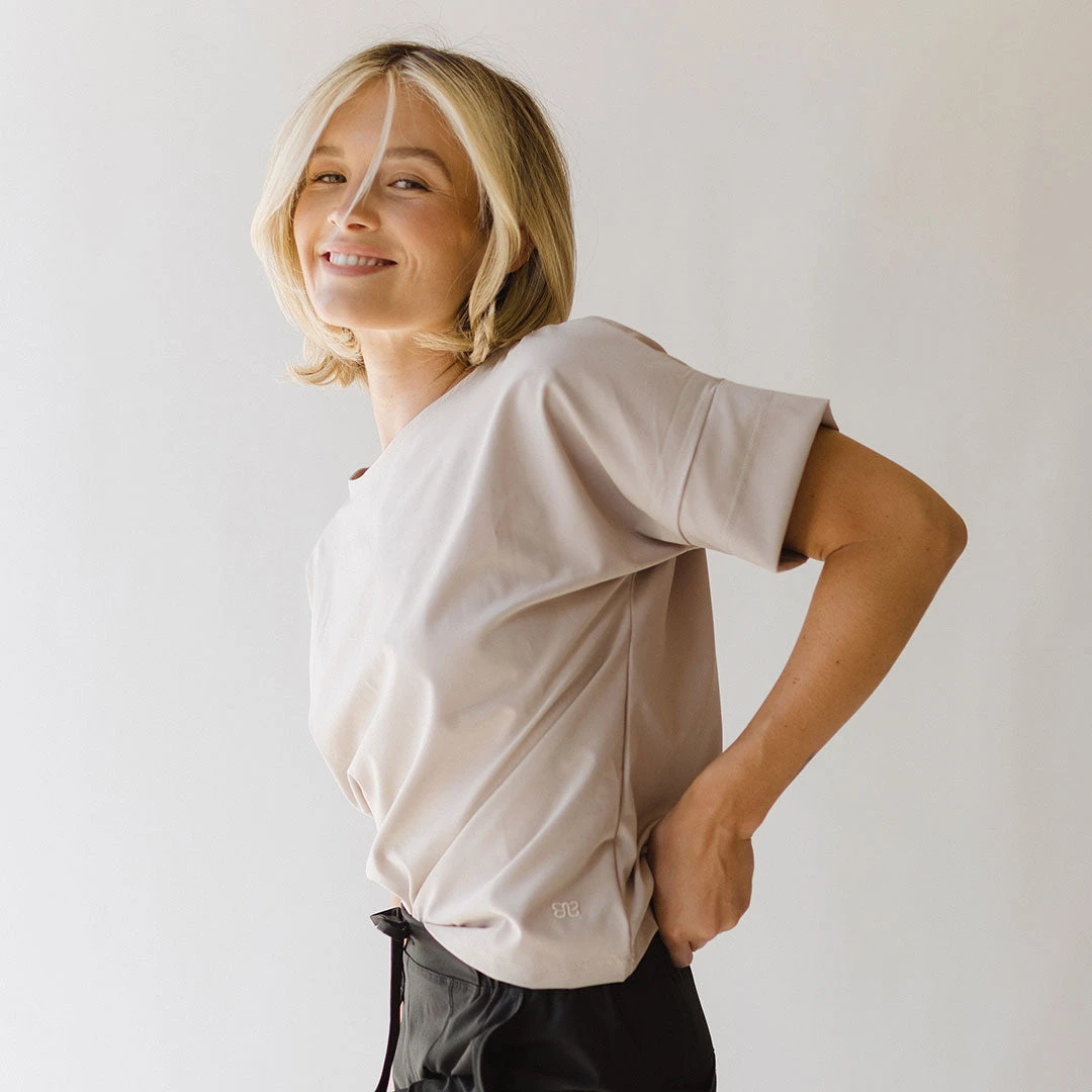 Business casual is easy to achieve with the chic Boss Crop Tee. This tan blouse has a statement cuff sleeve and a slightly boxy fit, cropped to the perfect length to go with your favorite slacks or high-waisted jeans. Ready to layer up, this tee is a staple you’ll reach for in any season.