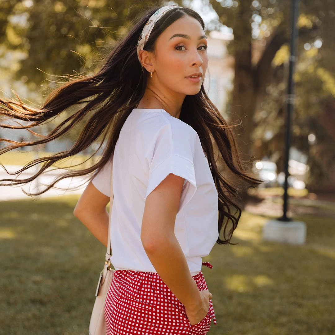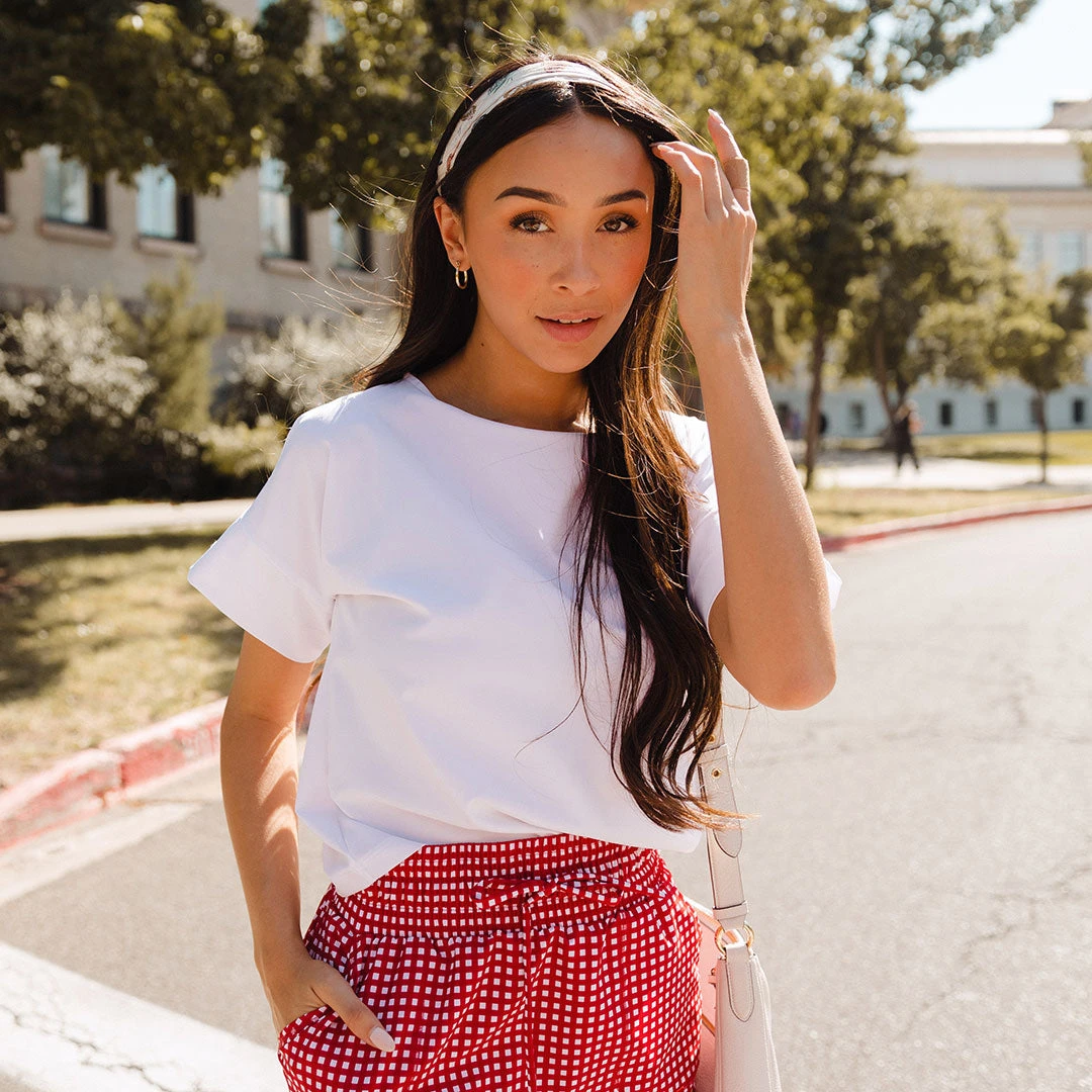 You asked, we answered! Our favorite Boss Crop Tee in a bright, goes-with-anything white. A great work piece, this white cropped blouse has a smooth boatneck, loose fit, and pairs amazingly with