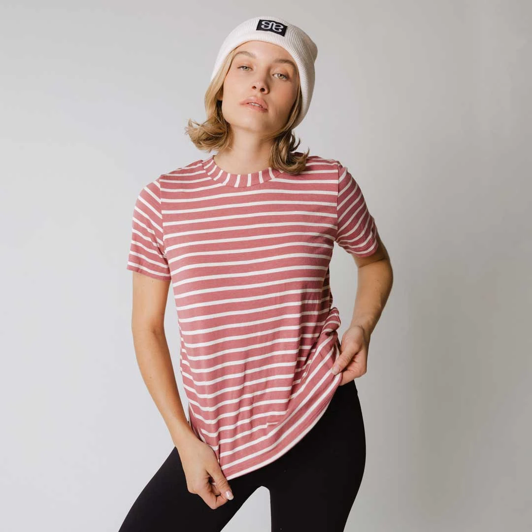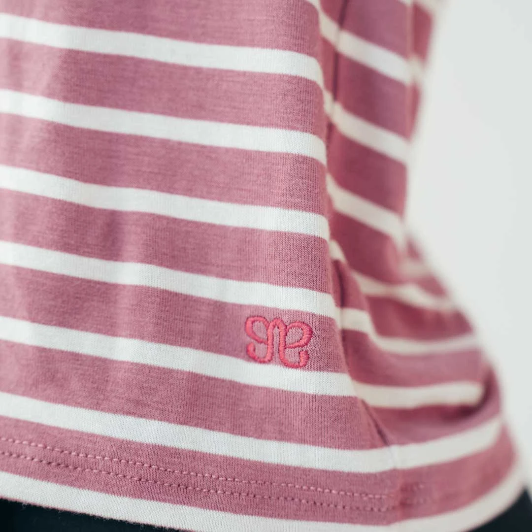 A soft ivory and mauve stripe brings just a touch of color to this effortless women’s tee. A relaxed fit, full sleeve, and amazingly comfortable fabric make this basic an absolute “must-have” for your closet!