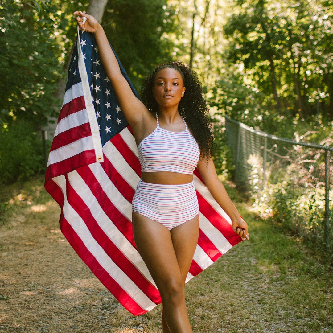 Serious full coverage and support, but make it Fourth of July-worthy! A totally classic red, white, and blue swim, our ruched high-waisted bottoms are ready to celebrate in style.