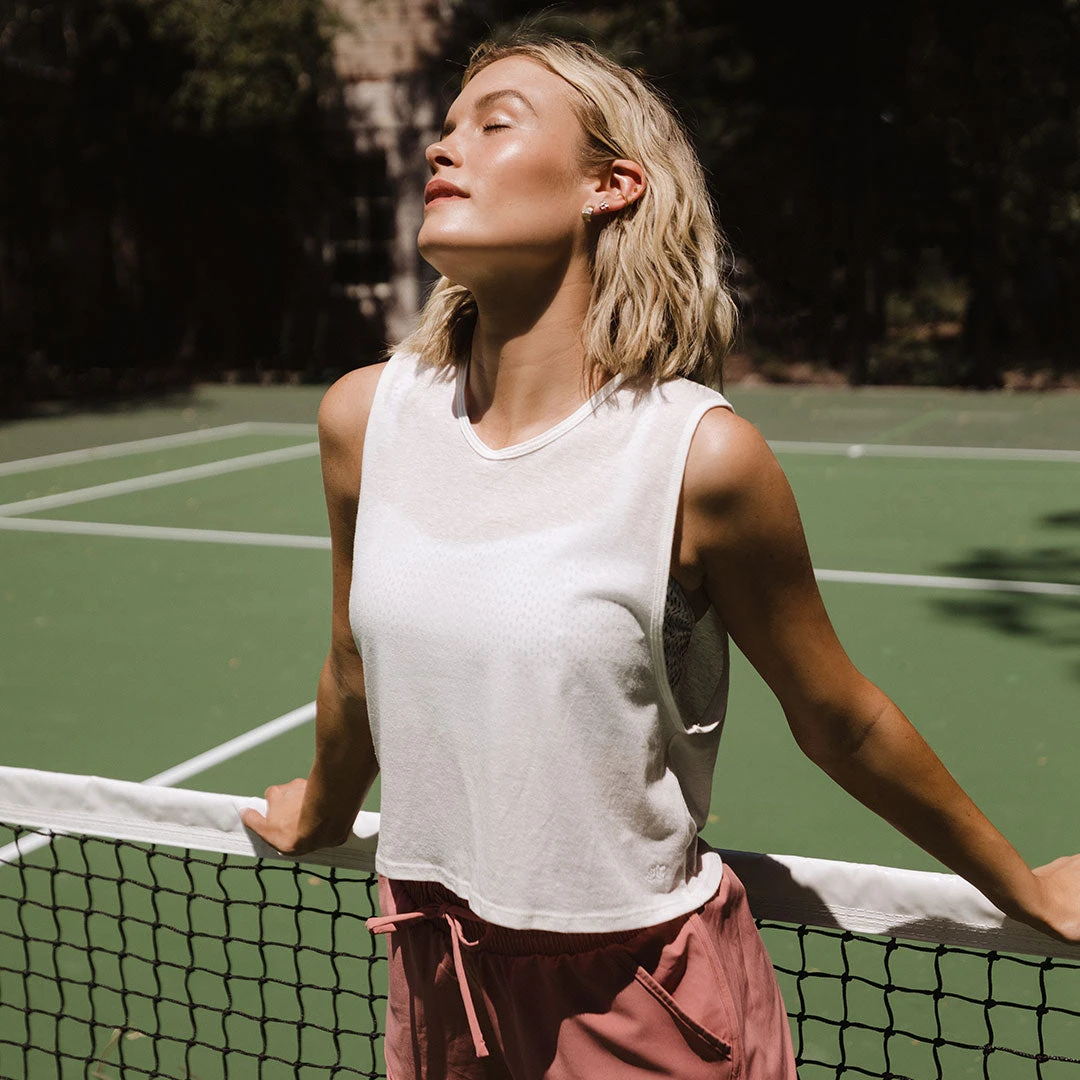 Flowy, breathable, with a slightly cropped fit and a knot detail at the back. Functional with a bit of a flair to add some style to your workout! Perfect for pairing with your favorite Albion workout bottoms and bra, let your arms breathe with plenty of coverage. Your new favorite workout tank is here!