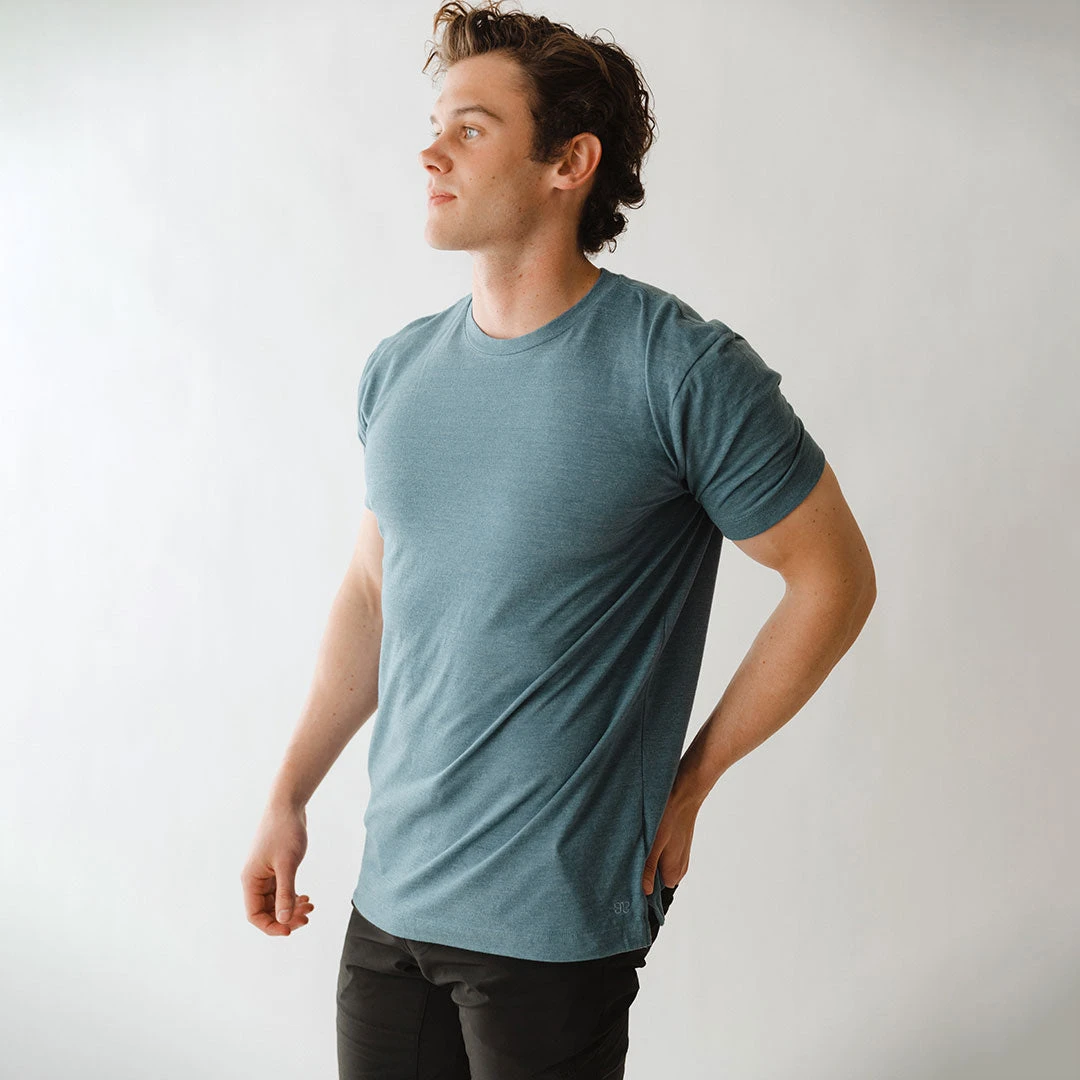 Every guy needs a great blue crew neck tee, it’s a classic! This one is lightly heathered in our softest fabric, ready for a slim fit or size up for a more relaxed look. The perfect top for cozy