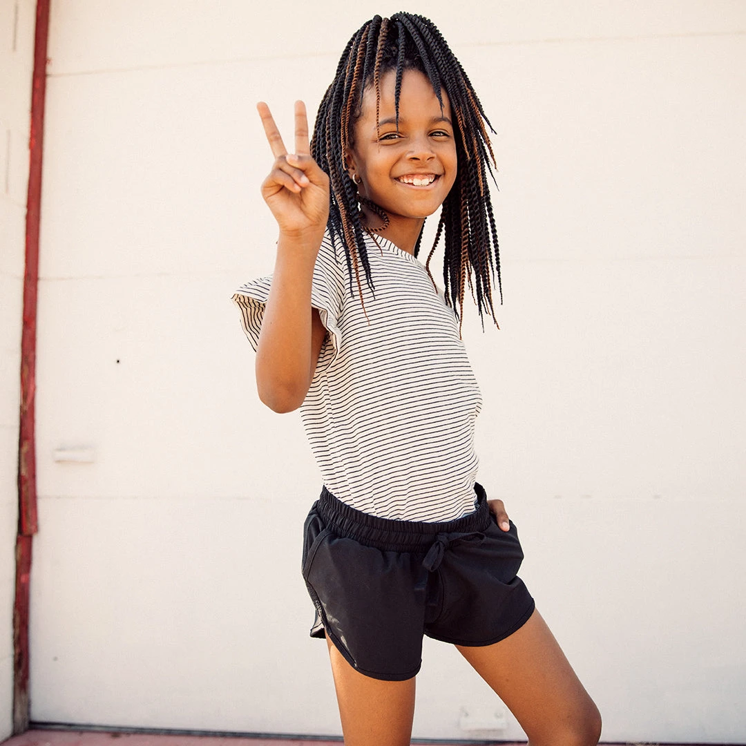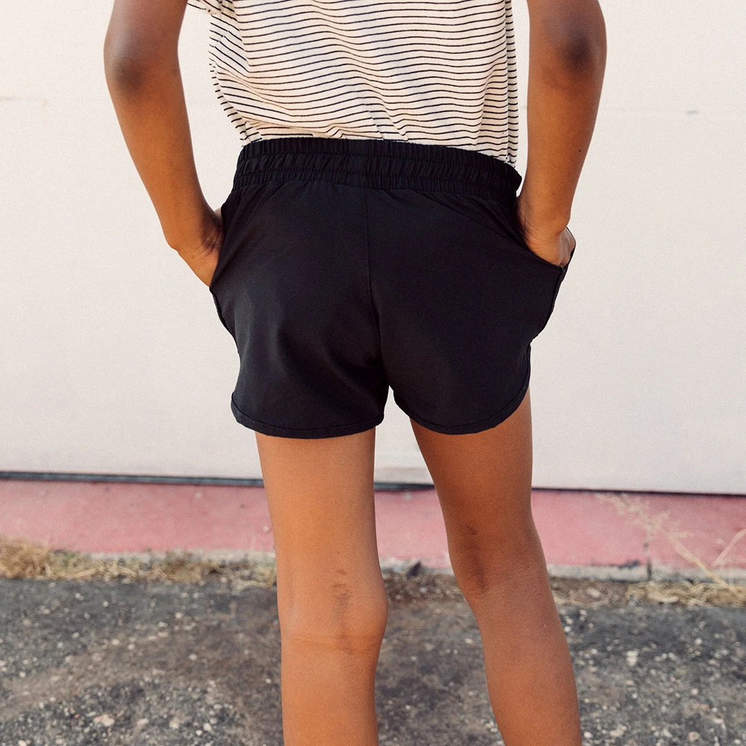Mini Sprinter Shorts with the perfect length, featuring an elastic drawstring waistband and pockets! In classic black, these shorts allow her to move and play with ease. Skip, run, twirl, or jump – these shorts will take her on all of her adventures in comfort and style!