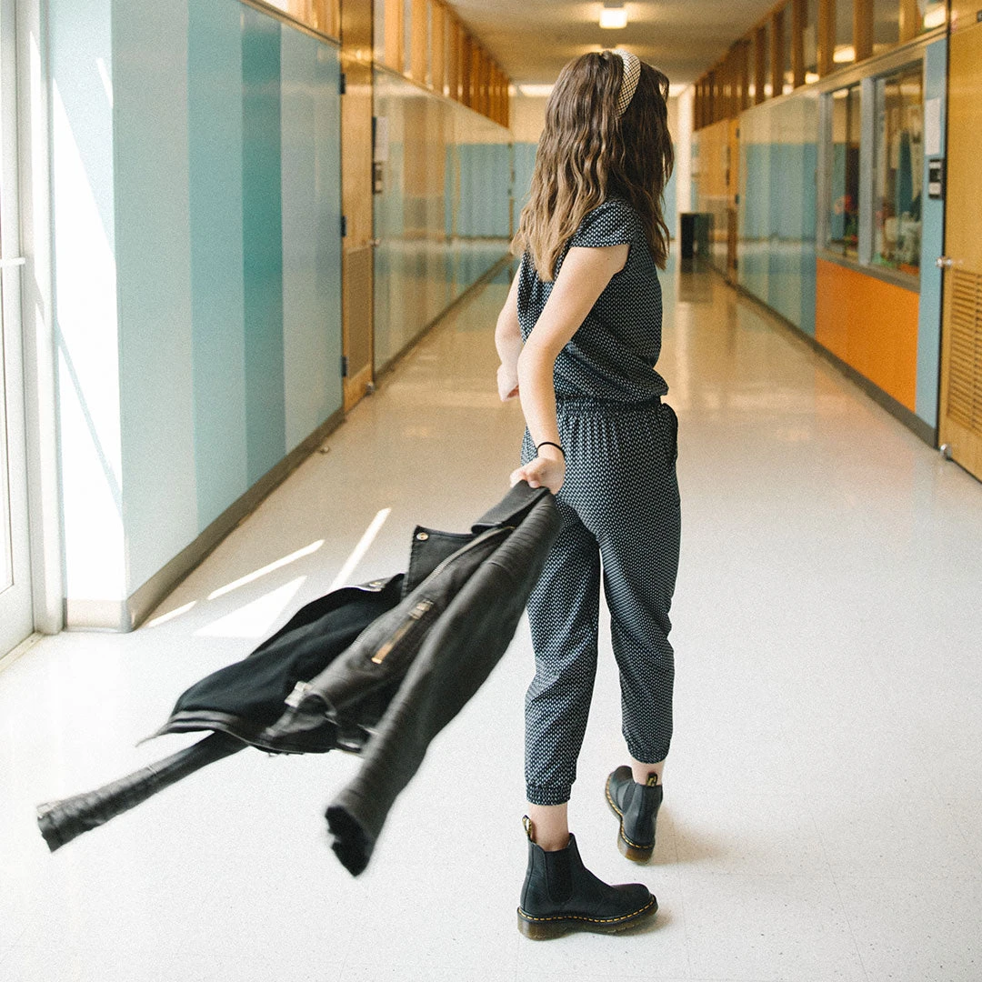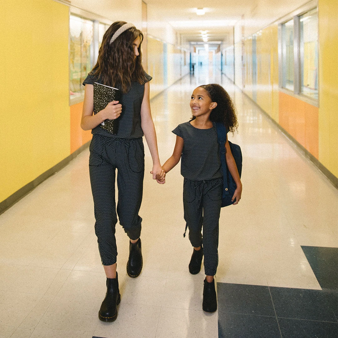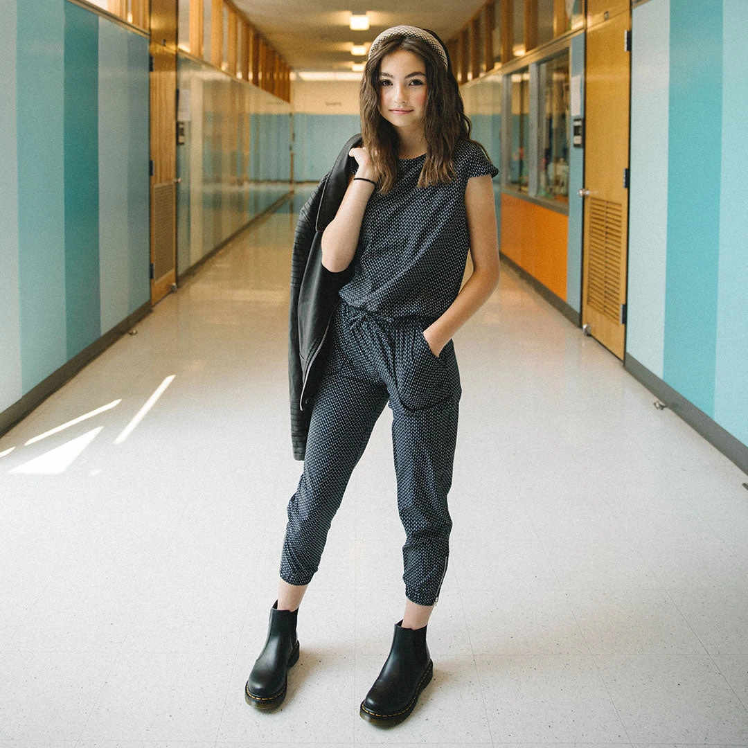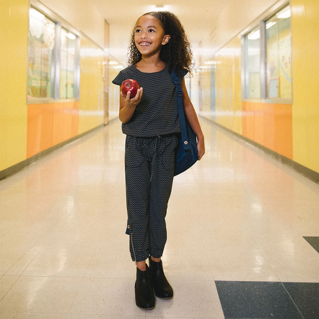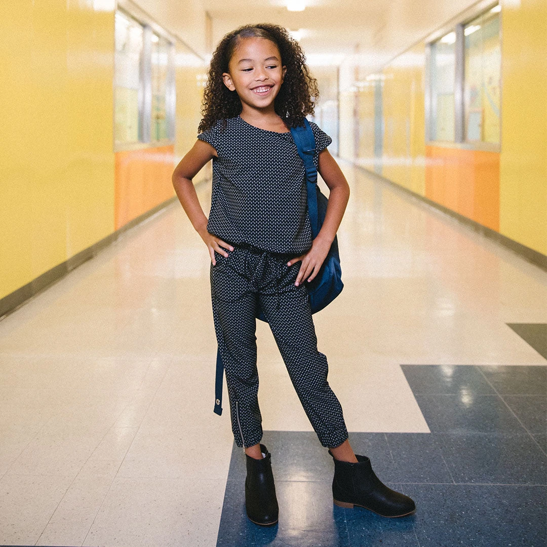 The mini jumpsuit is back in our favorite subtle Dash print. With a comfortable drawstring waist, fun zipper details, and front pockets, this jumpsuit is perfect for dancing, playing, or twinning with your mini-me in family pictures.