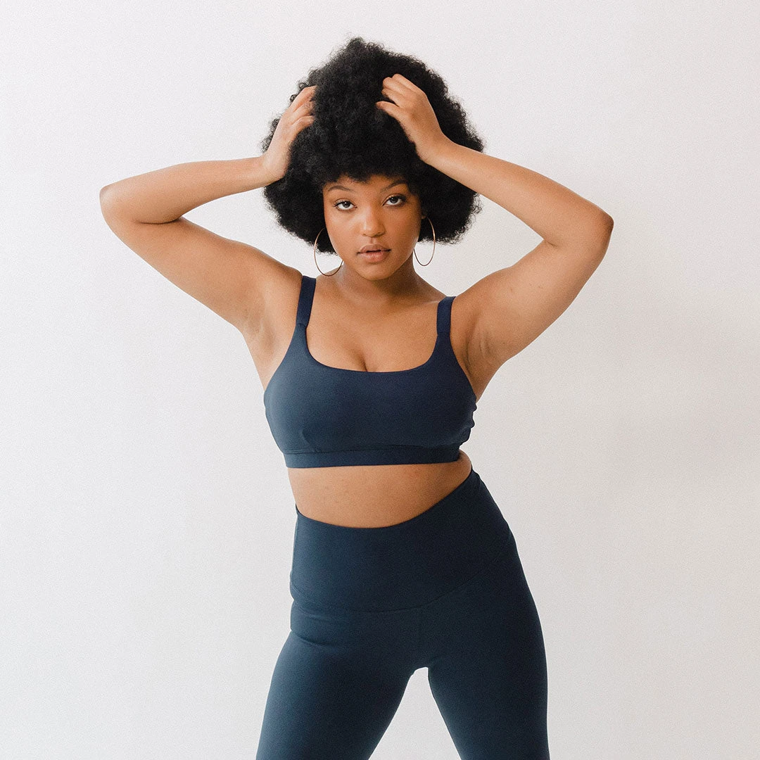 Meet our Navy Momentum Bra, a workout/swim top designed to maximize your comfort AND confidence. With thick straps and a sturdy waistband, this bra will stay in place all day long!