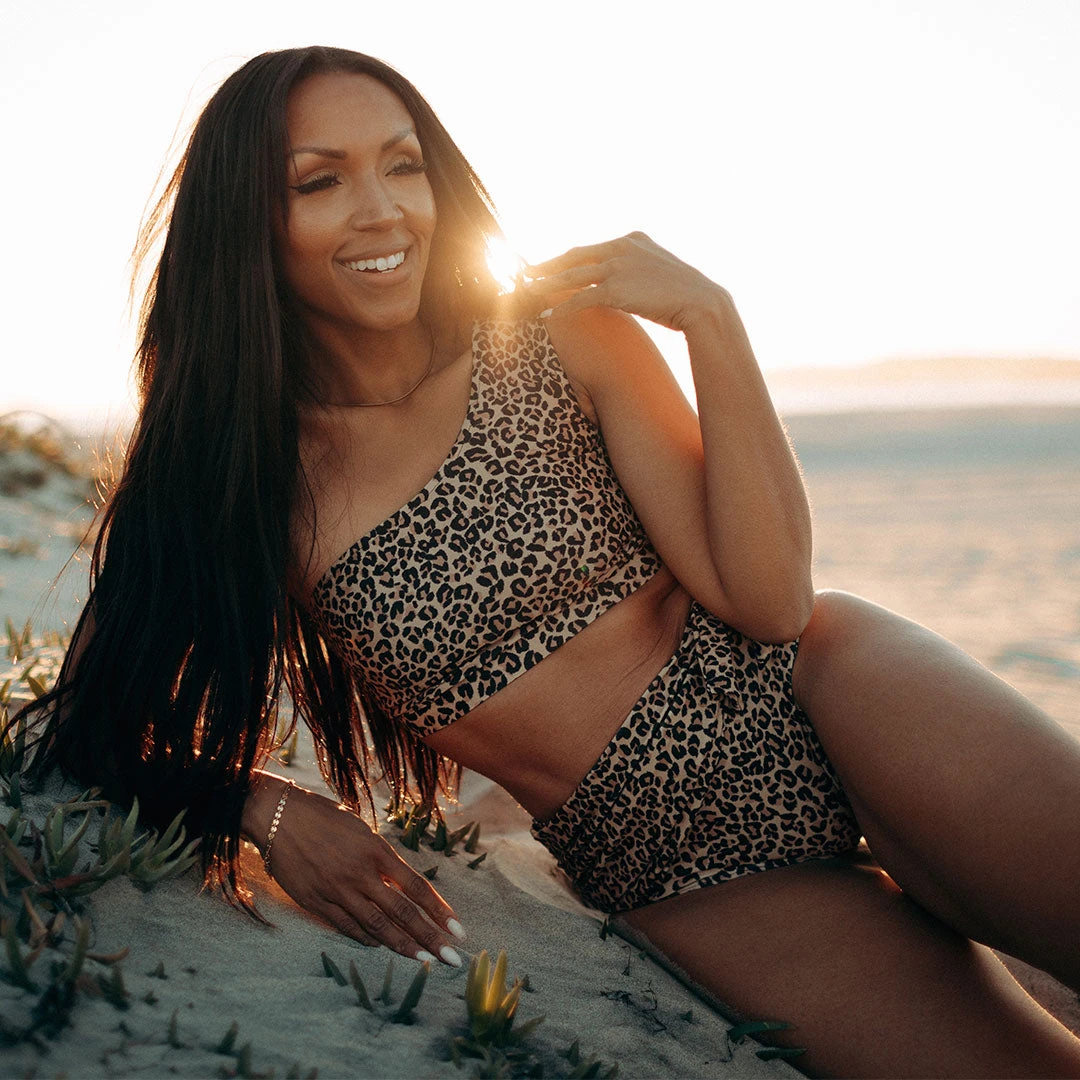 A one shoulder wonder meets cheetah for a swimsuit that’s almost too good to be true. Eye-catching and head-turning, this Albion Fit swim top provides support and makes a statement all at the same time. The shelf bra and fully lined crop provides support and coverage.