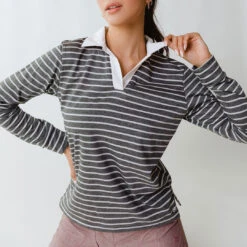 Preppy, neutral, clean-cut, and fabulous! Our grey stripe rugby tee will dress up your look, while still keeping you comfortable! It’s unique, feminine, button-free, and the perfect compliment to our