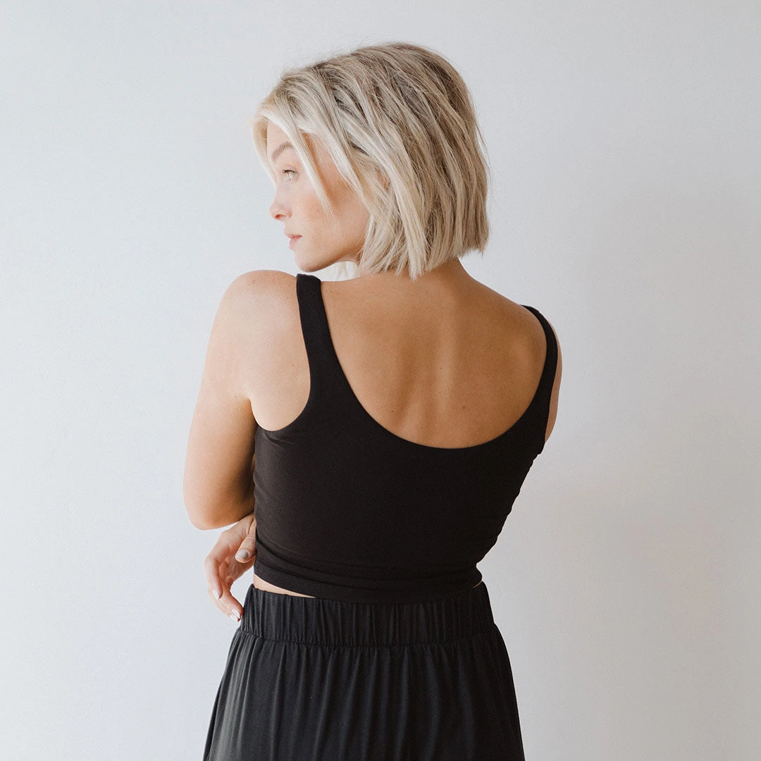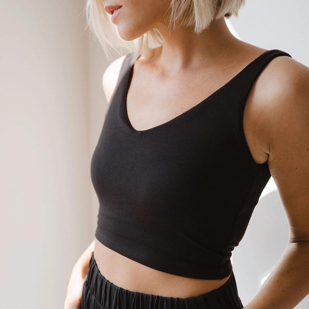 A more relaxed version of our Focus Tank, the Serenity Focus Tank is one you’ll find yourself lounging in, all day long! Perfect for a relaxing yoga session or taking it easy at home, the v-neckline and scoop back are a flattering fit for any body. Made with a built in shelf bra and supportive straps, and in a classic black, so you can feel your best no matter where you go!