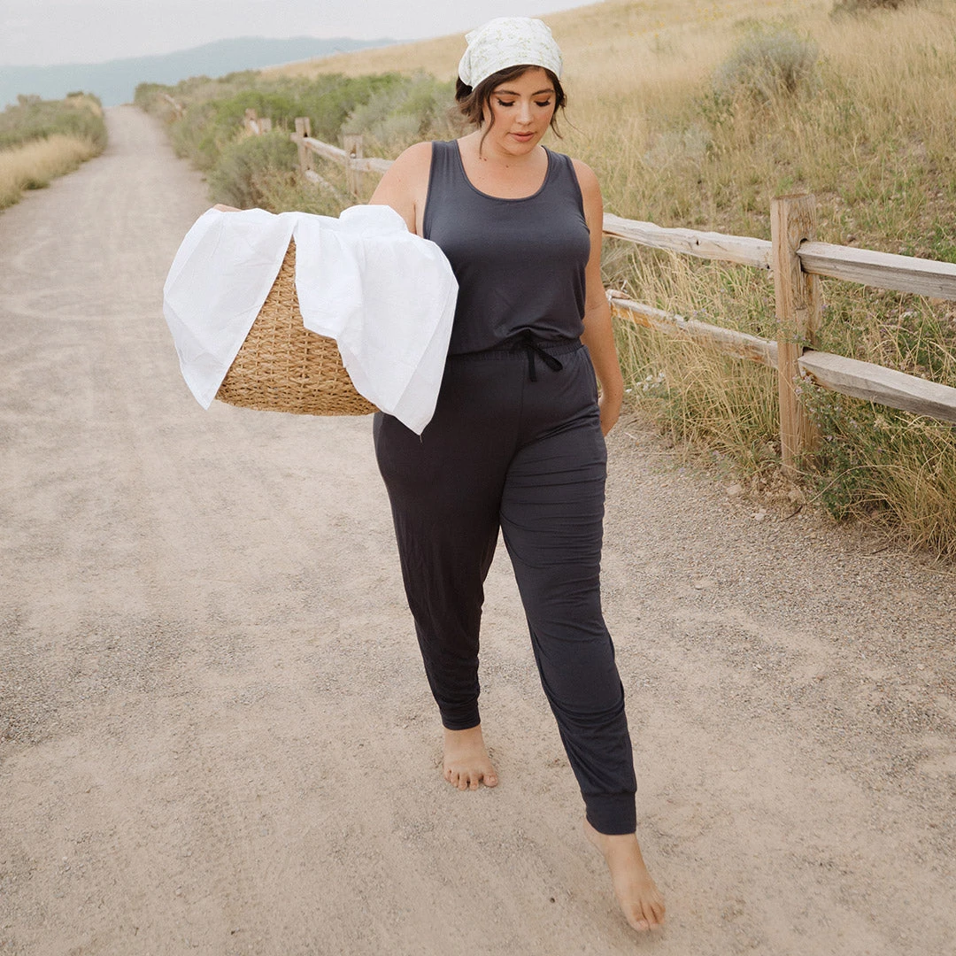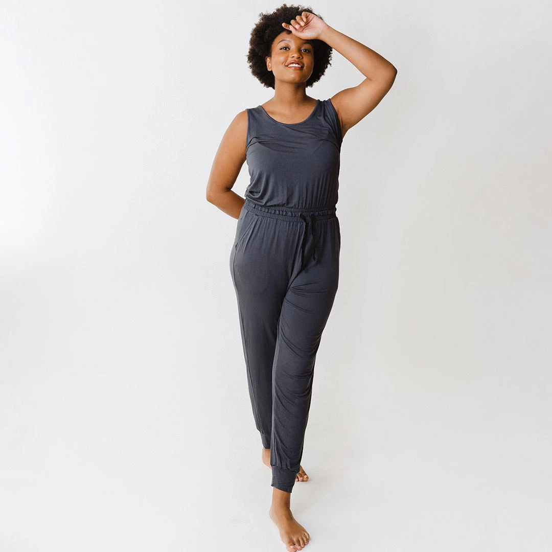 A classic grey for a classic look. This go-anywhere or stay at home women’s jumpsuit is going to be your go-to! Made in our best-selling, softest-ever, bamboo fabric, you’ll never want to take it off. Complete with figure flattering elastic and drawstring waistband, and a scoop neckline to fit any body. Pair it with your favorite sneakers and Albion bomber for going out!