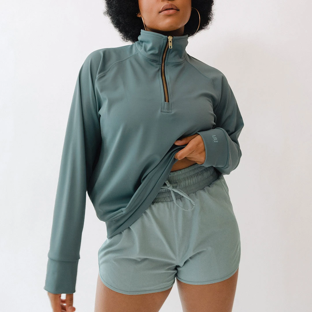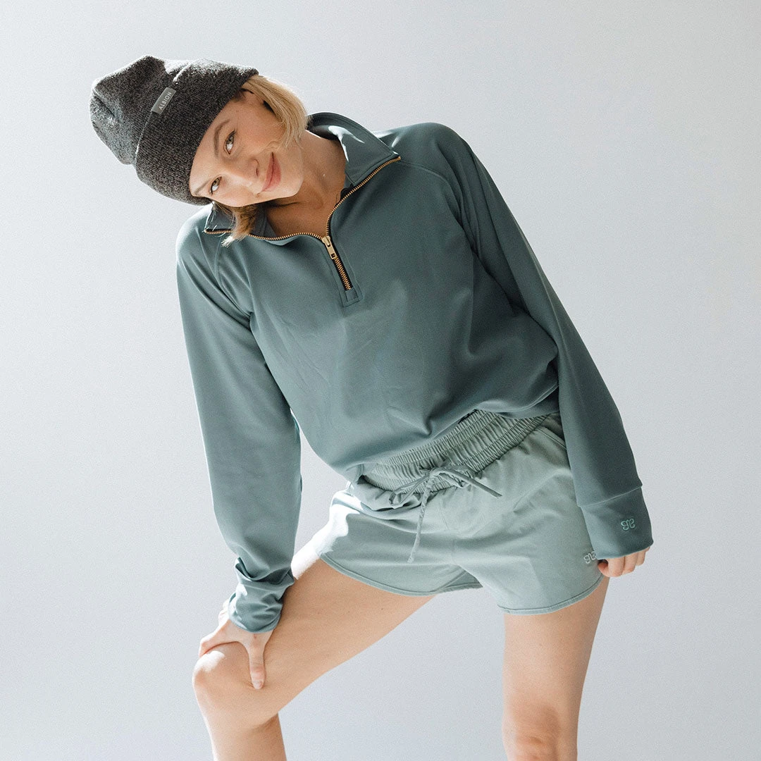 We made our Gotta Run 1/4 Zip pullover to last long after your workout ends! This women’s quarter zip features a dazzling gold zipper, and roomy pockets in a gorgeous grey blue shade we LOVE!Â